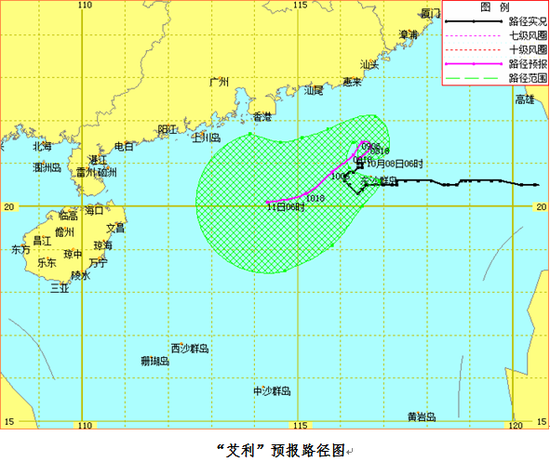 省气象台预计,8日~10日 “艾利”移速减慢,将在南海北部海面徘徊少动,强度维持或略有增强,最强可达台风级(12级,33~35米/秒),11日将向西偏南方向移动,逐渐向海南岛东部海面靠近,强度缓慢减弱。