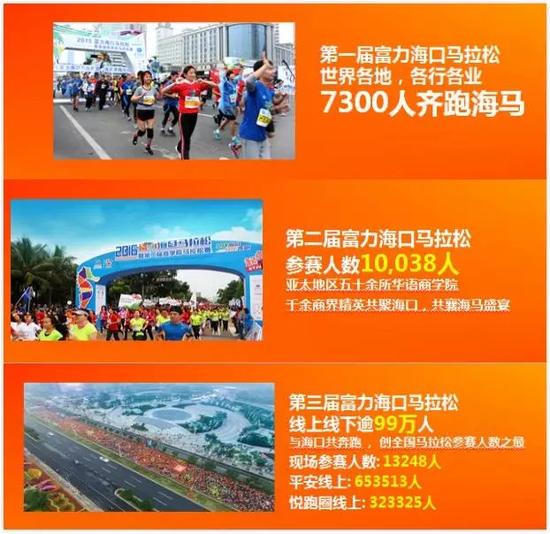 海口马拉松到今年已经举办了3届,经过富力三年的倡导与努力,越来越多的人知道了海马,加入了海马,开启了健康、欢乐的旅程。这是海口史上规模空前的马拉松赛事,尤其是2017年,富力地产联手中国平安通过同步开展的线上马拉松,吸引了线上线下逾99万人与海口共奔跑,创全国马拉松参与人数之最!