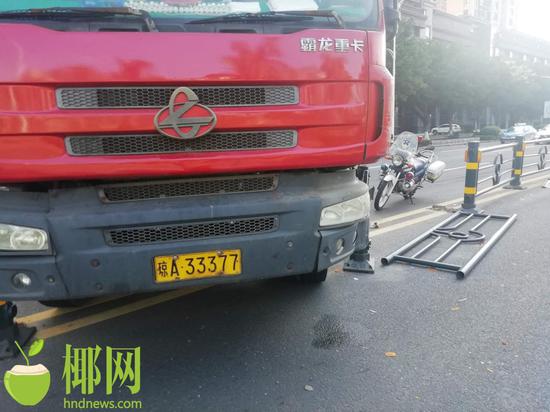 商报全媒体讯(椰网/海拔手机端记者 柯育超)11月18日下午约2时许,海口长堤路西往东方向长堤明珠小区门口附近发生惊险的一幕,一辆大货车因紧急避让前车,撞上道路中间隔离护栏。值得庆幸的是,该起事故未造成人员伤亡,对向车道也无车辆受影响。