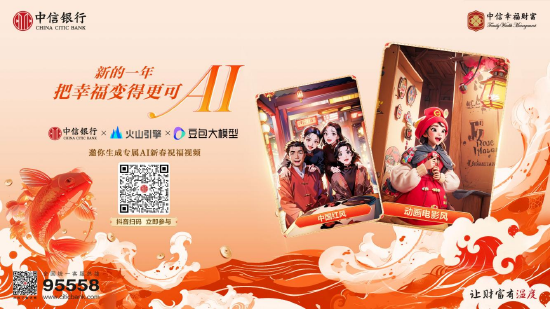 中信银行始终站在时代前沿,精准洞察科技与金融融合的无限潜力。在农历小年来临之际,中信银行以“把幸福变得更可ai”为话题,携手豆包大模型推出银行业首个AIGC新春祝福视频共创活动,打破传统金融服务边界,带来集科技魅力、新春祝福与互动趣味于一体的全新体验,邀请全民参与,开启新春华章。