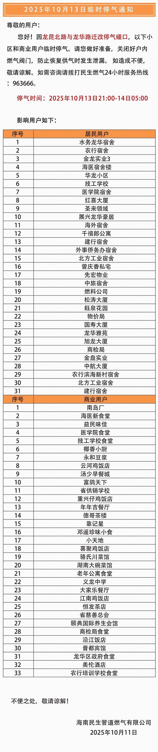 商报全媒体讯(椰网/海拔新闻记者 王辉)10月12日,记者从海南民生管道燃气有限公司获悉,因海口龙昆北路与龙华路迁改停气碰口,海口部分小区和商业用户将于10月13日21:00—14日5:00临时停气。请市民做好准备,关闭户内燃气阀门,防止恢复供气时发生泄漏。